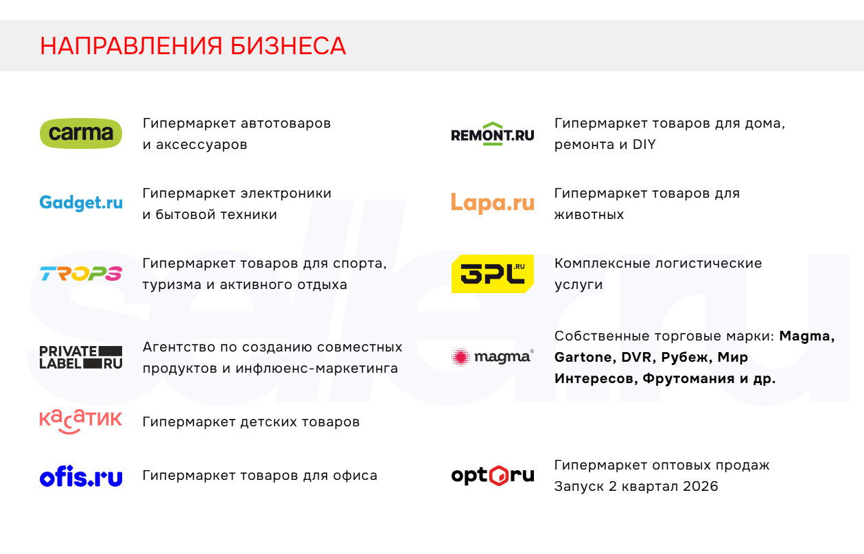 — группа компаний с многопрофильной экосистемой, объединяющая специализированные гипермаркеты, IT и интеллектуальные разработки, а также складскую инфраструктуру.